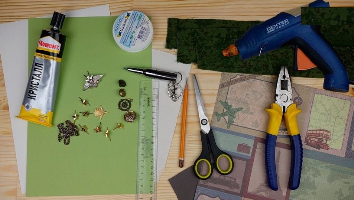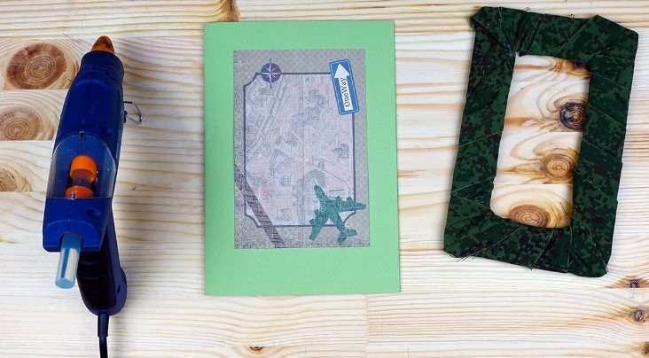 Такая вот открытка смотрится интересно, а делается очень просто. Для прочности лучше закрепить детали на картоне. Пожелание можно написать на отдельном листе или с другой стороны. А если вложить открытку в конверт, получится настоящее письмо солдату.