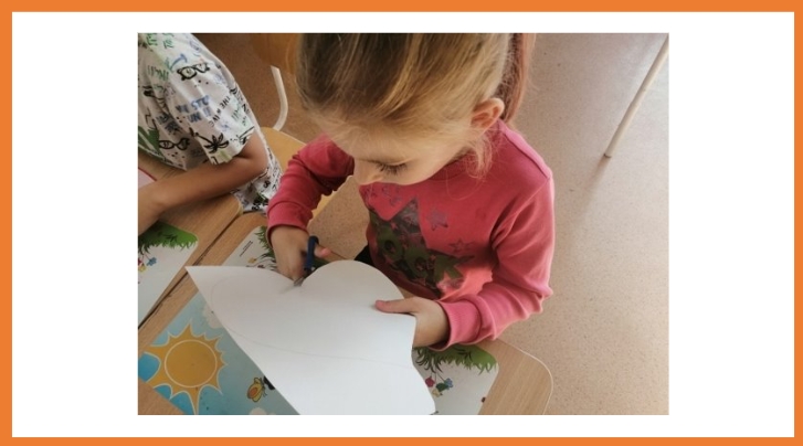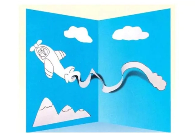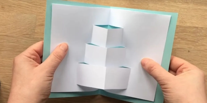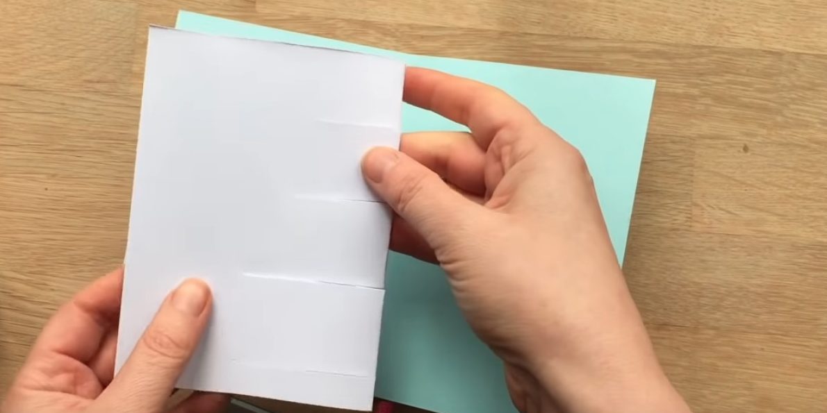- Для внутренней части открытки понадобится лист белой бумаги формата A4, отступите от верхнего края несколько сантиметров, сделайте надрезы, получившиеся края заверните внутрь.
