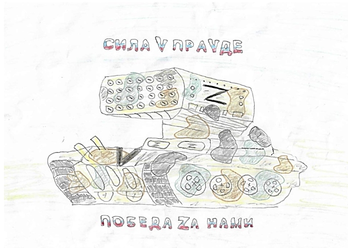 Известная латинская буква «V», так же используется на военной технике, ее в народе трактуют, как Победу. Наряду с другой символикой, «V» изображают на рисунках и патриотических плакатах.