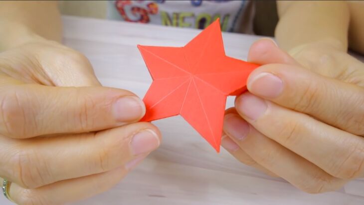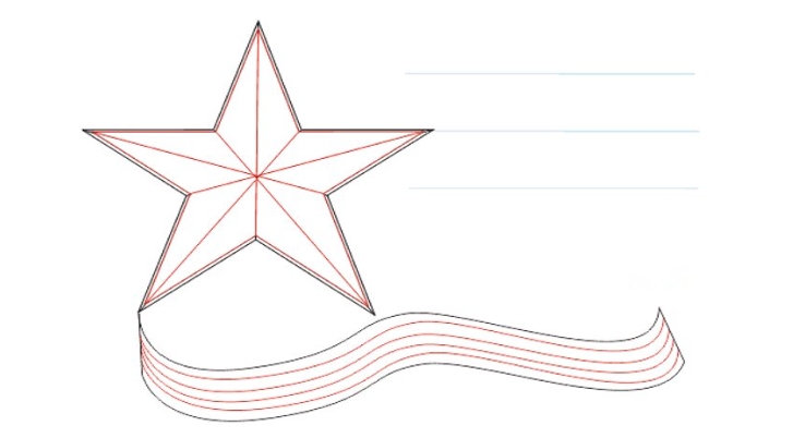 Из красного листа вырезается звезда, по размеру она должна быть меньше, чем та, которую вырезали из основы. Если каждый луч согнуть пополам, звезда приобретет объем. Боковые края подгибаются.