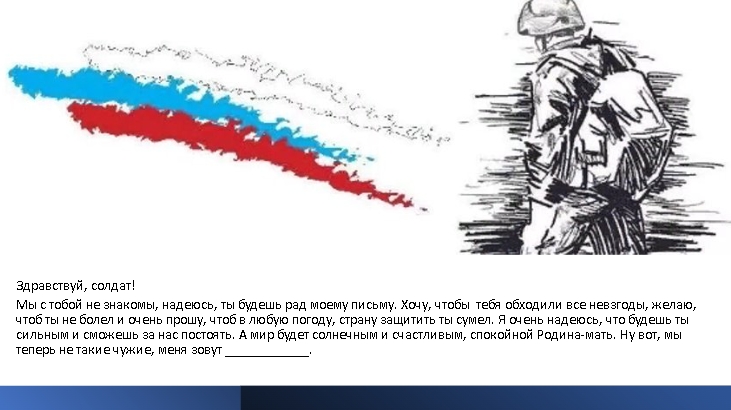 Здравствуй, незнакомый и дорогой моему сердцу солдат! Я знаю, что в нашей стране живут мирные народы и никто не хочет войны. Спасибо тебе за то, что ты не жалея сил и жизни всегда готов защитить нас. Наша Победа, это заслуга твоя и твоих товарищей, которые сражались с тобой плечо к плечу! Хочу сказать тебе большое спасибо!