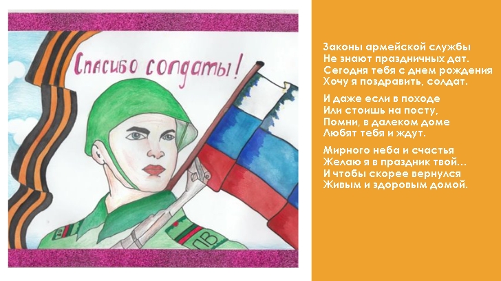 В каждой семье есть защитники Отечества, неплохо привлечь детей к поздравлению солдатам, которые сейчас находятся на фронте. Это доставит радостные минуты воинам, а ребята лишний раз вспомнят, что есть такая профессия — Родину защищать.