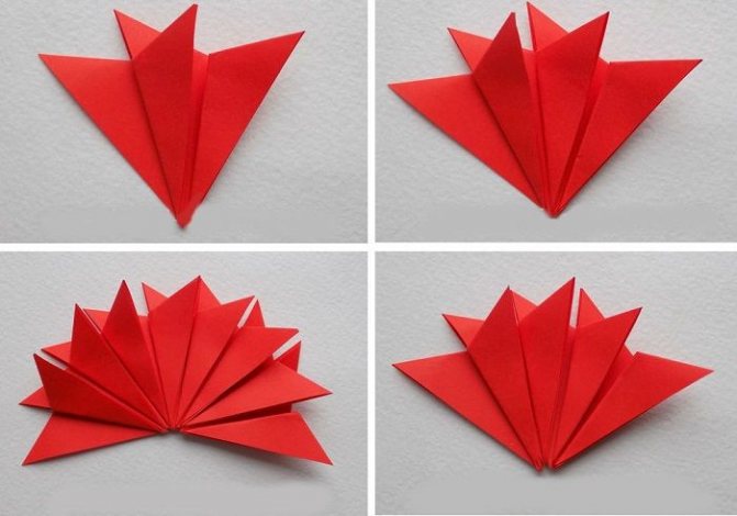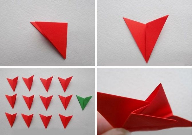 - Нарезать 12 квадратов из красной бумаги и 1 из зеленой, их размер, приблизительно 6 на 6 сантиметров. Согнуть каждый по диагонали, далее треугольник по высоте. Должна получится симметричная фигура.