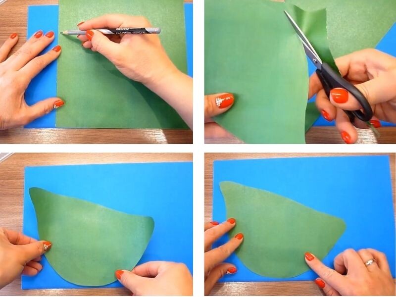 - Лист зеленой бумаги поделите на три части, средняя должна быть больше, загните по бокам, отверните лацканы.