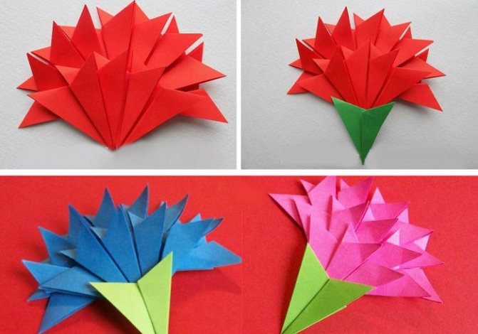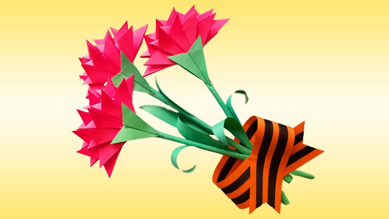 Красные гвоздики олицетворяют пролитую воинами кровь за свою Отчизну, а, так же, мужество, храбрость, свободу. Эти цветы всегда вручаются солдатам-победителям в качестве талисмана над поверженным врагом. Если сделать для открытки несколько цветков, получится живописная композиция, которую можно сочетать с другими элементами.