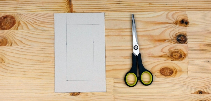 Из другого листа картона вырежьте прямоугольник 12 на 19 сантиметров. Отступите по три сантиметра с каждой стороны, проведите прямые линии, вырежьте по ним еще один прямоугольник в центре.