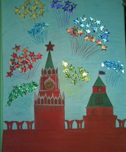 В честь торжества справедливости, мира и добра в нашей стране всегда дают салют, его можно нарисовать, сделать с помощью цветной бумаги, пластилина или других подручных материалов.