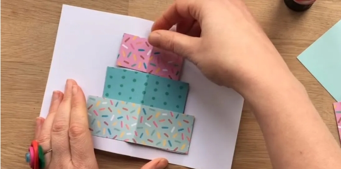 5. Для тортика возьмите яркую бумагу, вырежьте прямоугольники, высотой побольше вырезанных полос, приклейте их к белой основе.