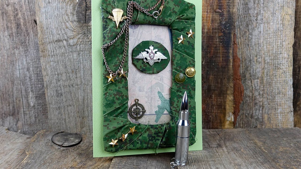 Еще один вариант оригинальной открытки, которая подойдет для поздравления воину на фронте.