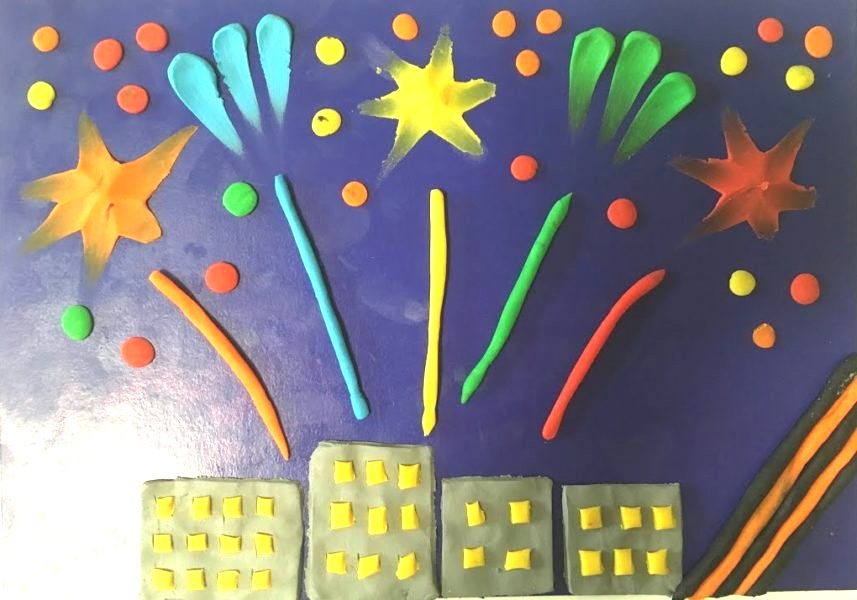 открытки из пластилина своими руками: лицевая сторона открытки - салют из пластилина.