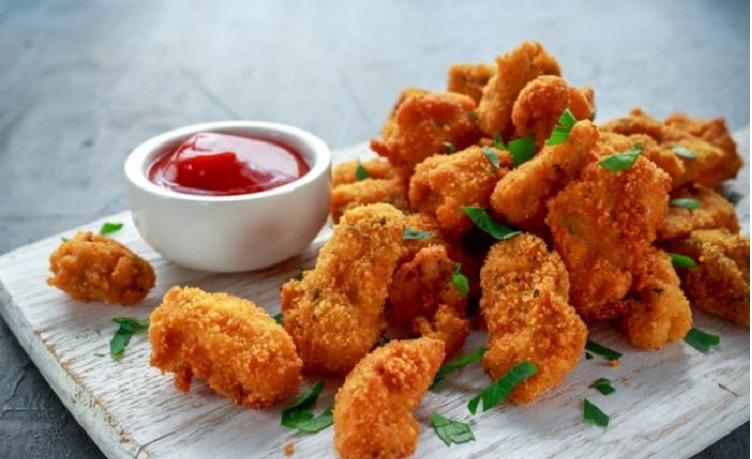 Кусочки куринного филе окунуть во взбитое яйцо, после обвалять в панировке. Завершает процесс обжарка в большом количестве растительного масла.