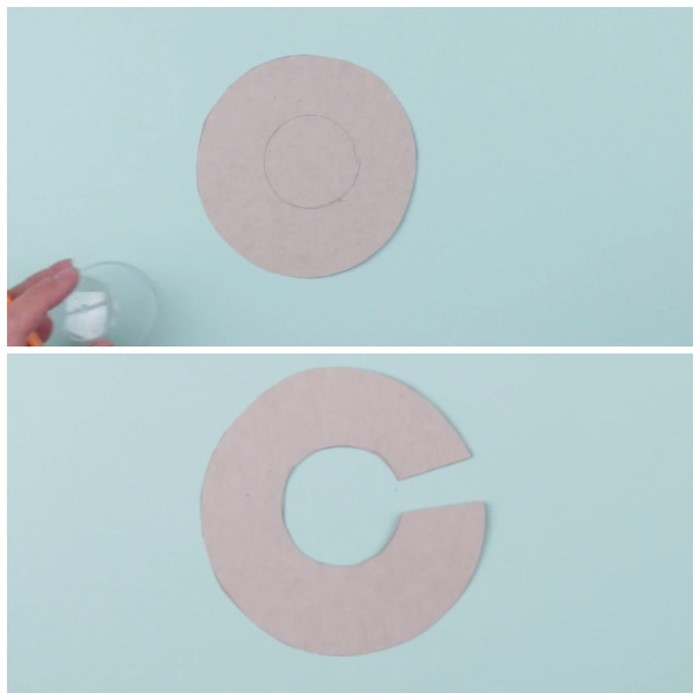 В центре начертите круг меньшего диаметра. Вырежьте деталь, обрежьте с одной стороны неширокий отрезок, так чтобы получилась заготовка в виде буквы «С».