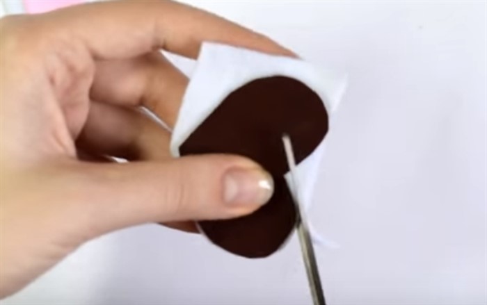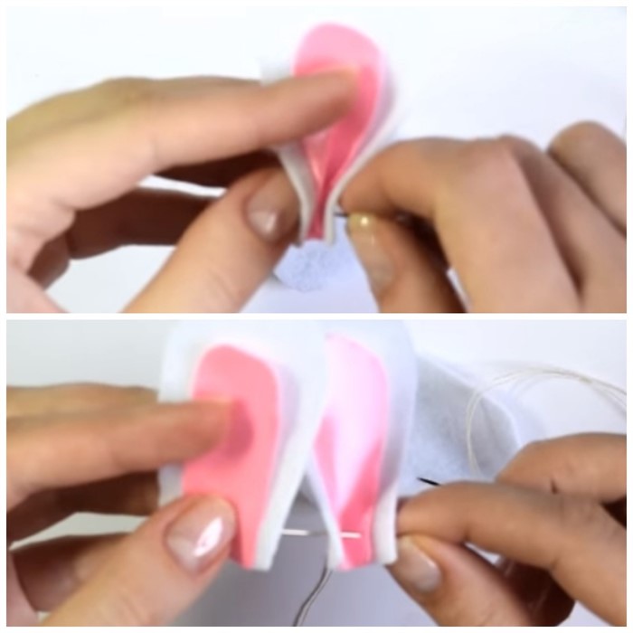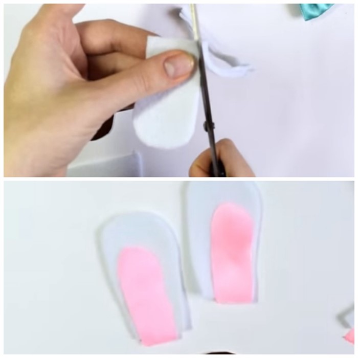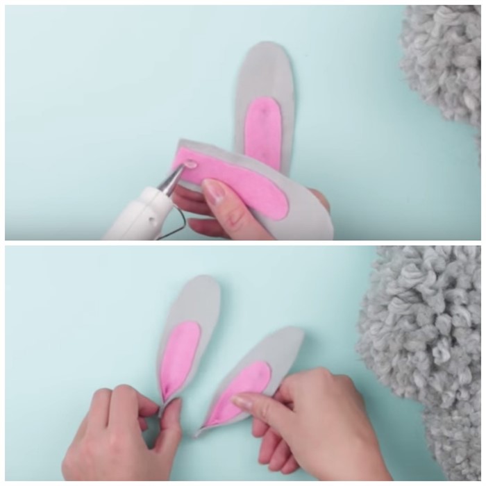 Из серого и розового фетра вырежьте силуэты ушек, затем наклейте розовое ушко на серое и склейте их у основания.