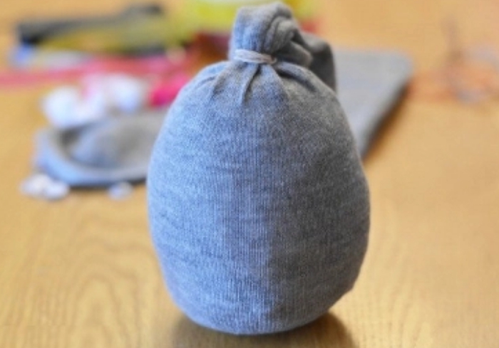 - Нижнюю часть носка до пятки наполните любым подходящим наполнителем или крупой.