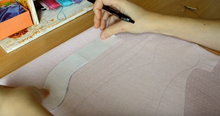 Ткань сложите пополам, прикрепите к ней булавками портновскими выкройки, обведите указанное на выкройке количество деталей.