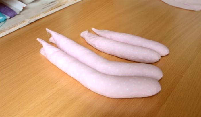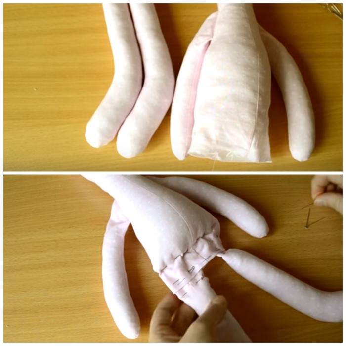 Тело выверните, набейте наполнителем, оставив 2 см внизу, пришейте ноги, предварительно зафиксировав обе ноги булавками.