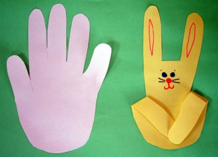 Обведите руку на цветной бумаге. Средний палец загните назад, а большой и мизинец — вперед. На безымянном и указательном нарисуйте силуэт зайца, дорисуйте мордочку.