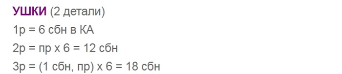 Ушки также провяжите до желаемой длины, провязав последний ряд убавками. Сложите ушки у основания пополам и пришейте к голове. Оформите глазки бусинами, а носик стежками.