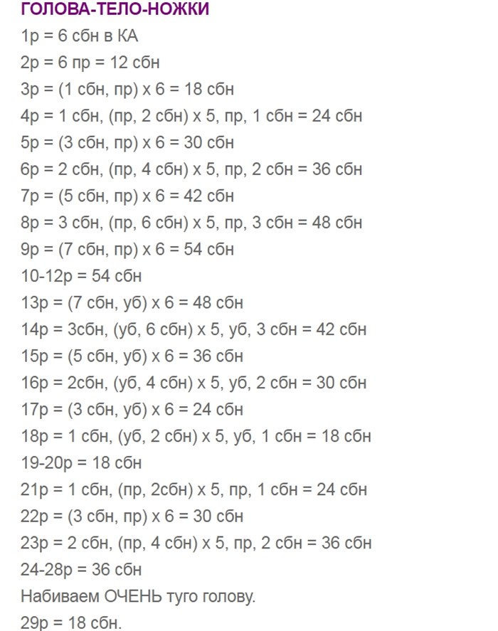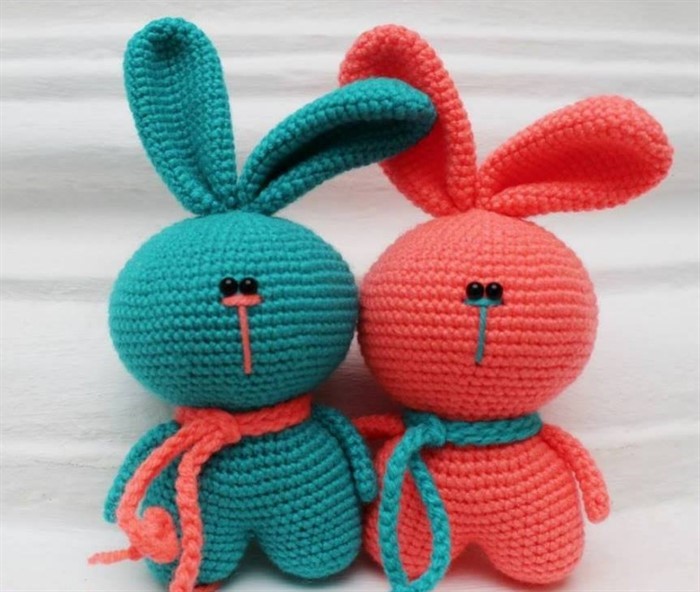 Первый столбец нового ряда провяжите в первую петлю предыдущего. Тем самым разделите туловище на 2 части, которыми и будут ножки. Обе ножки вяжутся по одному и тому же принципу, а кролик набивается по мере вязания.