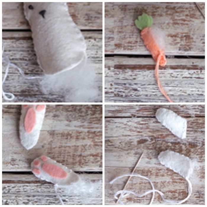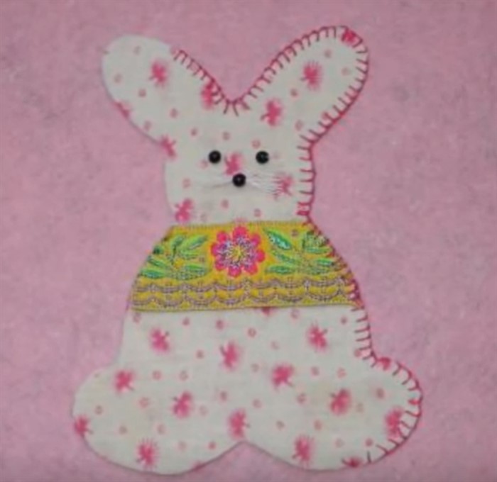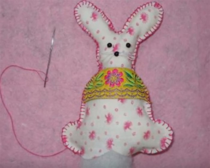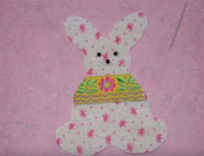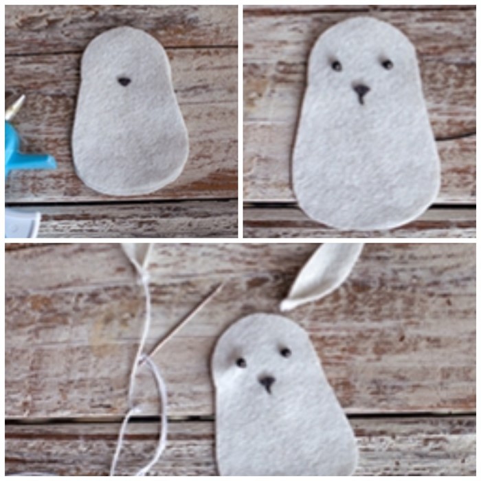 - К туловищу приклейте носик и глазки. Пришейте сложенные у основания ушки.