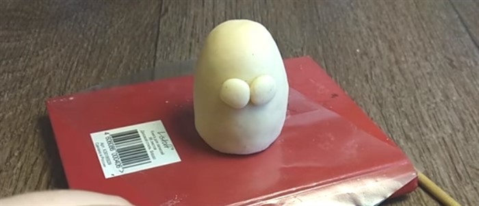 Скатайте 2 одинаковые кусочка теста, скатайте капельки. Сплюсните, приклейте на место глаз. Маленький кружок приклейте на место нижней губы.