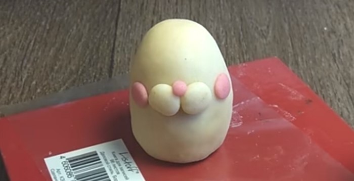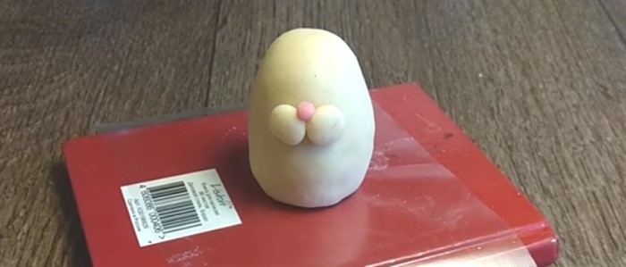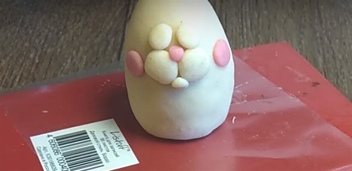 Скатайте 2 шарика одинакового размера, прилепите, сплюснув их к заготовке в том месте, где будет находиться мордочка кролика..