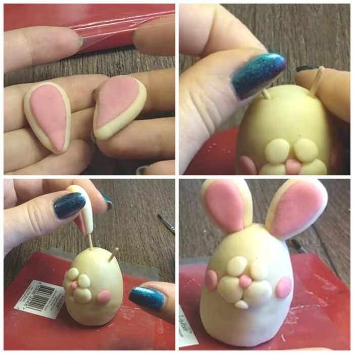 Из двух шариков сформируйте капельки, сделайте с них ушки. Примерьте ушки к голове, они должны смотреться пропорционально. Из розового теста сделайте капельки меньше, слепите между собой. Вставьте половинки зубочисток в место расположения ушей, насадите ушки.