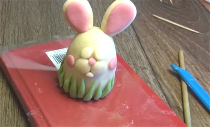 Вокруг кролика разместите зеленую травку, сплюскивая массу для лепки в капельки.