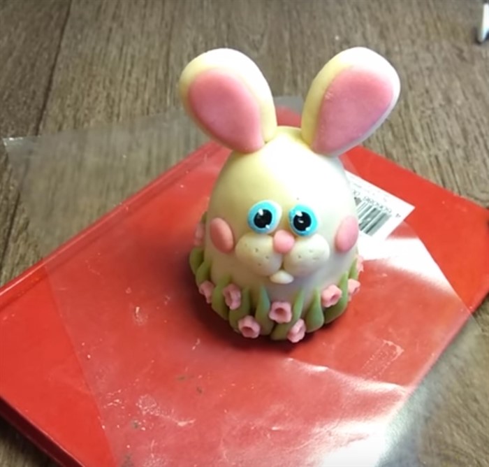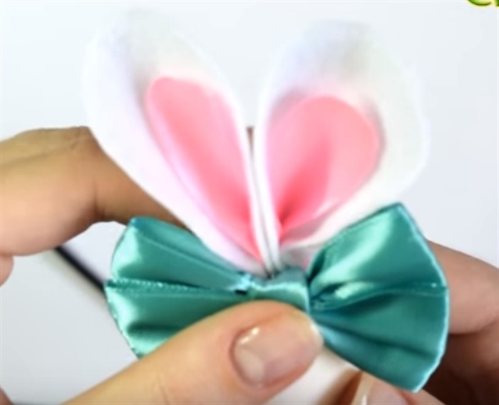 Клеевой стык между ушками и яйцом замаскируйте бантом. Как бант сделать описано тут: «Объемные банты».