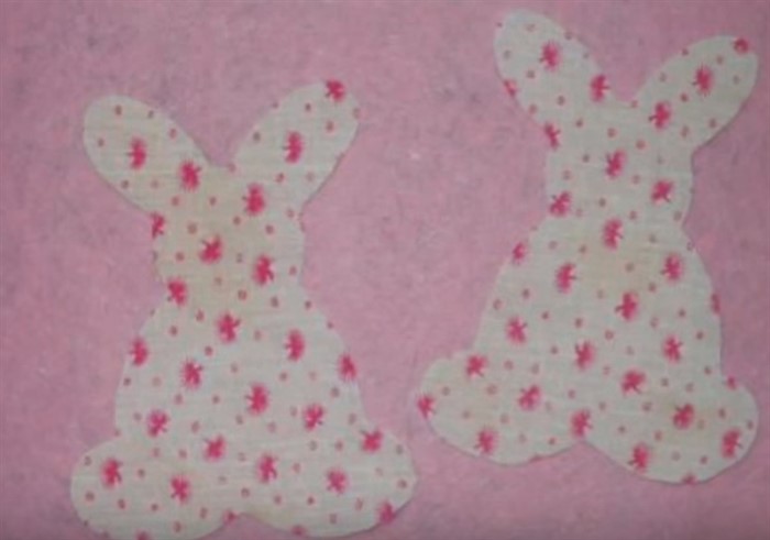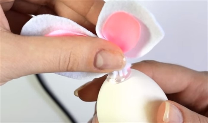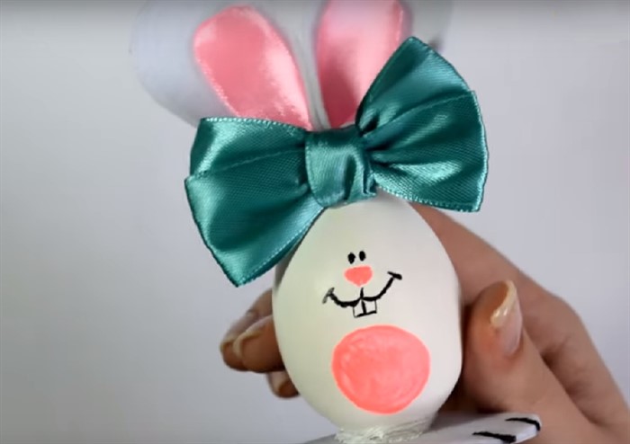 В яйце сделайте отверстие и извлеките содержимое. Из картона вырежьте сердечко, которое послужит подставкой под яичко и лапками кролика. Из белого фетра вырежьте ушки, а из розовой ленты продублируйте их силуэт только меньшего размера.