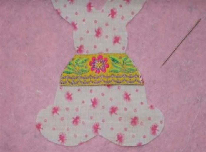 На одну из заготовок потайным швом пришейте пеструю тесьму.