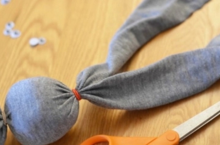 - Разрежьте свободную часть носка пополам. Лишнее обрежьте, сформировав ушки.