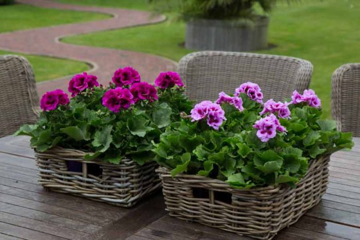 Подвесные и стационарные кашпо с ампельной пеларгонией прекрасно украсят террасу и балкон.