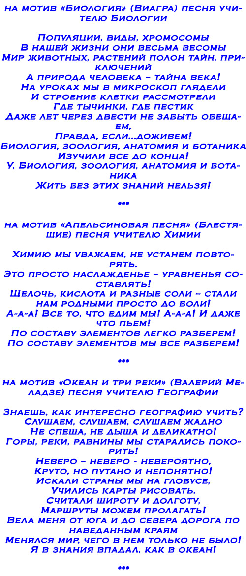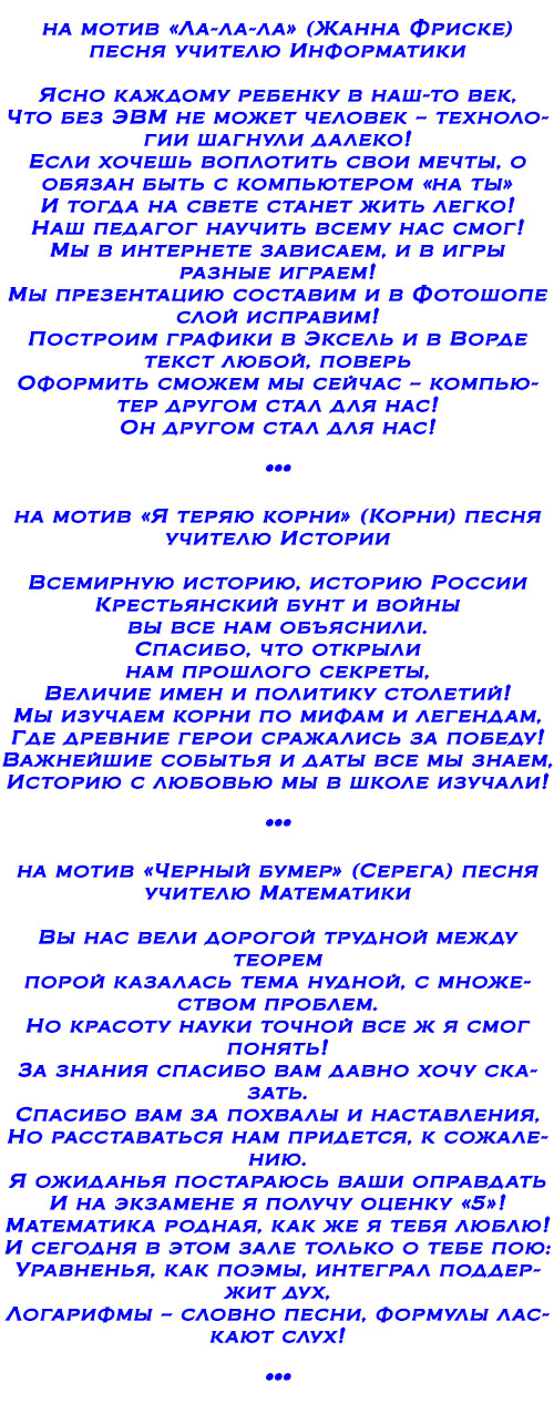 Выпускной пожалуй, самый главный праздник для школьников по завершению школы. К нему они готовятся по-особенному, на носу еще несданные экзамены, а будущие выпускники разучивают танцы, заучивают песни, стихотворения, разыгрывают сценки. Одним из ключевых номеров для проведения школьной программы являются переделанные песни на мотив знаменитых композиций. Так, собравшись на последней парте после уроков школьники мастерят новые куплеты, продумывают содержание каждой строчки. Но, чтобы сэкономить время, мы предлагаем воспользоваться нашими уже готовыми куплетами.