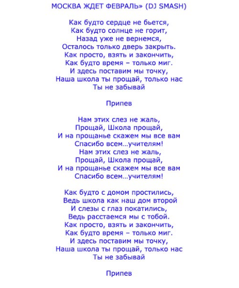 Песни-переделки для выпускного идеальны для концертного исполнения. Под звуки веселой музыки проходит грусть и тоска о школьных днях. Веселые переделки оживят своим мотивом даже самые лиричные моменты школьного выпускного. Стоит лишь правильно подобрать слова и сложить их в знакомую мелодию. Предлагаем вашему вниманию песню…., которая станет гвоздем вечерней программы.