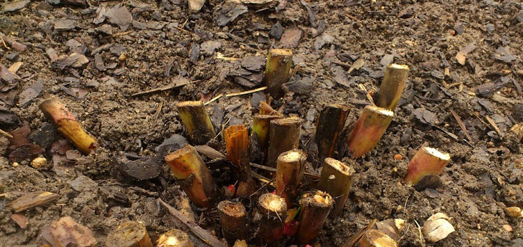 До прихода похолодания стебли нужно срезать до самого основания. Не нужно ничего оставлять на поверхности почвы, это может стать причиной заражения куста болезнетворной инфекцией. Все срезы присыпают природным антибиотиком, древесным пеплом.