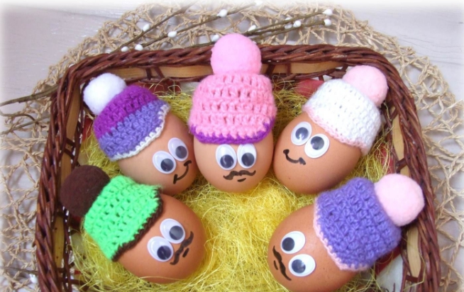 Вязаное крючком. Для тех, кто умеет вязать крючком, не составит особого труда связать самому декоративное яйцо. Для этого необходимо провязать 2 в.п., соединить их в кольцо. Затем провязать 1 в.п. и вводя крючок в кольцо вывязать 7 ст.б/н., замкнуть ряд. Затем связать 1 в.п. подъема и вязать ст.б/н делая прибавки в каждую п. предыдущего ряда = 14 ст. б/н, в следующем ряду провязать все ст. б/н, не делая прибавок. Вязать далее, повторяя ряд с прибавками и ряд и без прибавок еще 3 раза, чтобы получилось 35 ст.б/н. Затем еще 4 ряда вязать ровно, после чего начинать вязать ряды, выполняя убавления сначала через 5 п., затем через 4 п, через 3 п., через 2 п. Наполнить вязаное яйцо синтепоном и продолжить вязать делая через 1 п., зашить макушку.