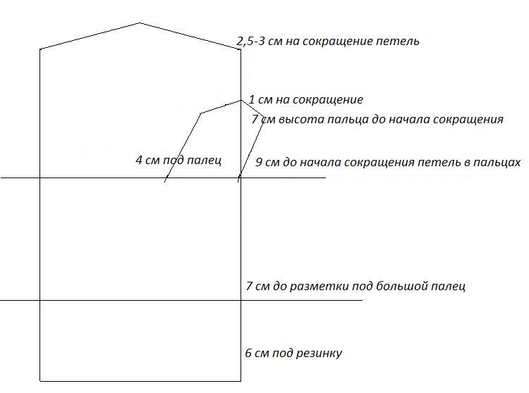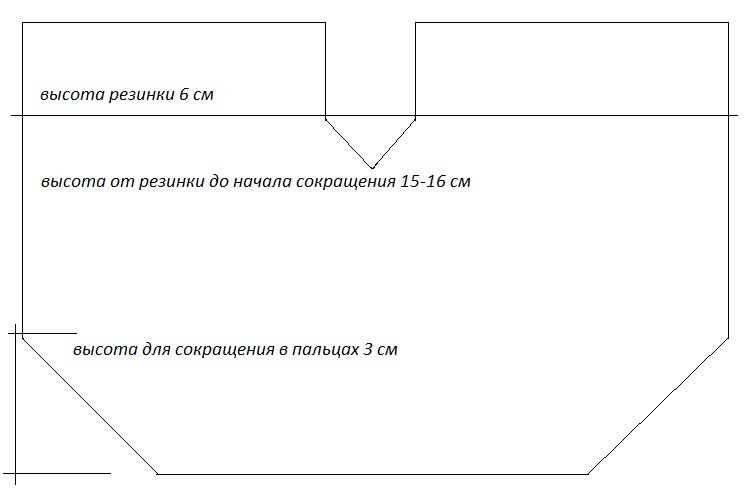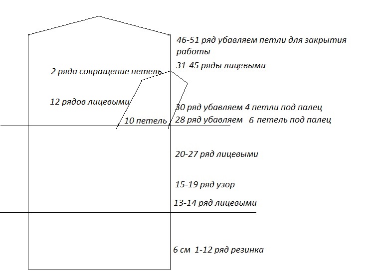 - Длина пальца одинаковая 12 рядов + два ряда на закрытие.