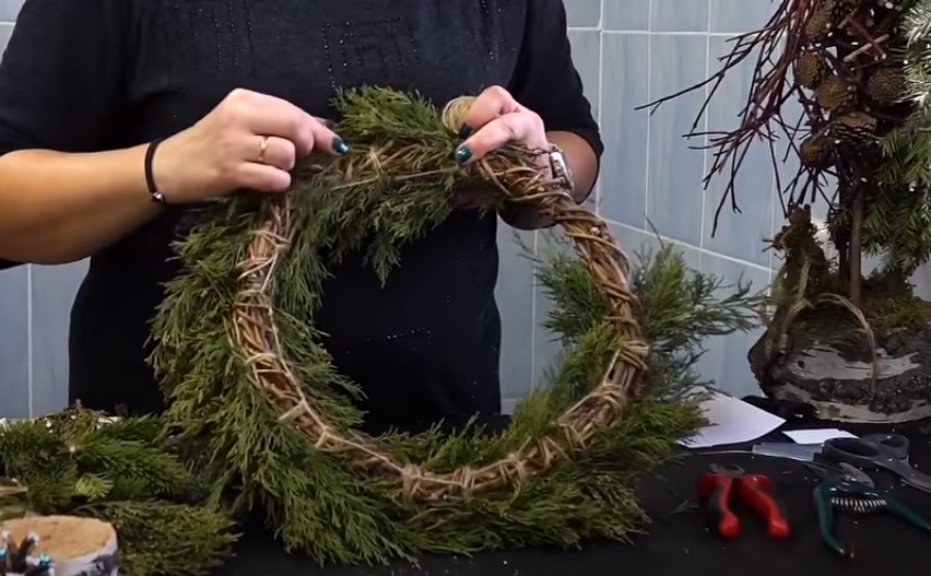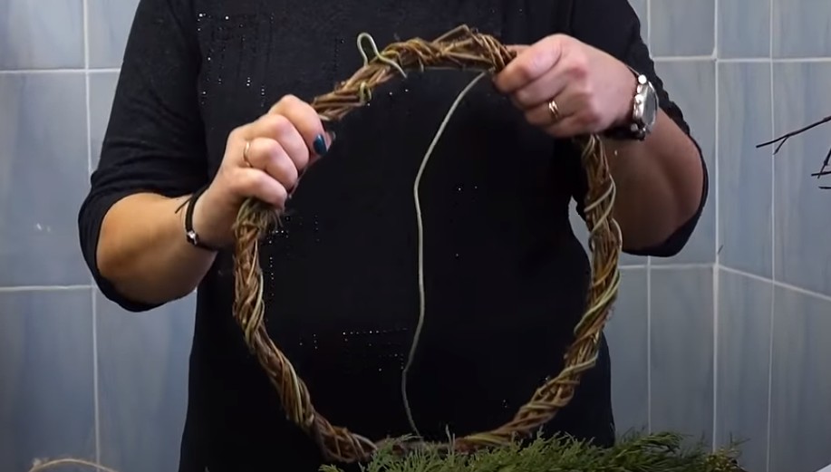 Для обвязки венка подойдет толстая проволока, шпагат, флористическая лента или толстые нитки.