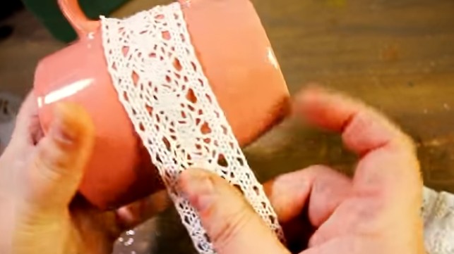 Отрежьте полоску декоративной бумаги, ее ширина должна соответствовать высоте банки, наклейте ее на боковую внешнюю часть двусторонним скотчем