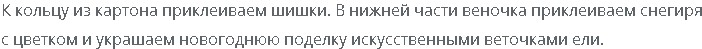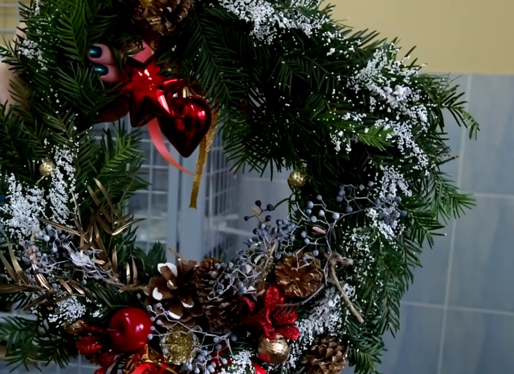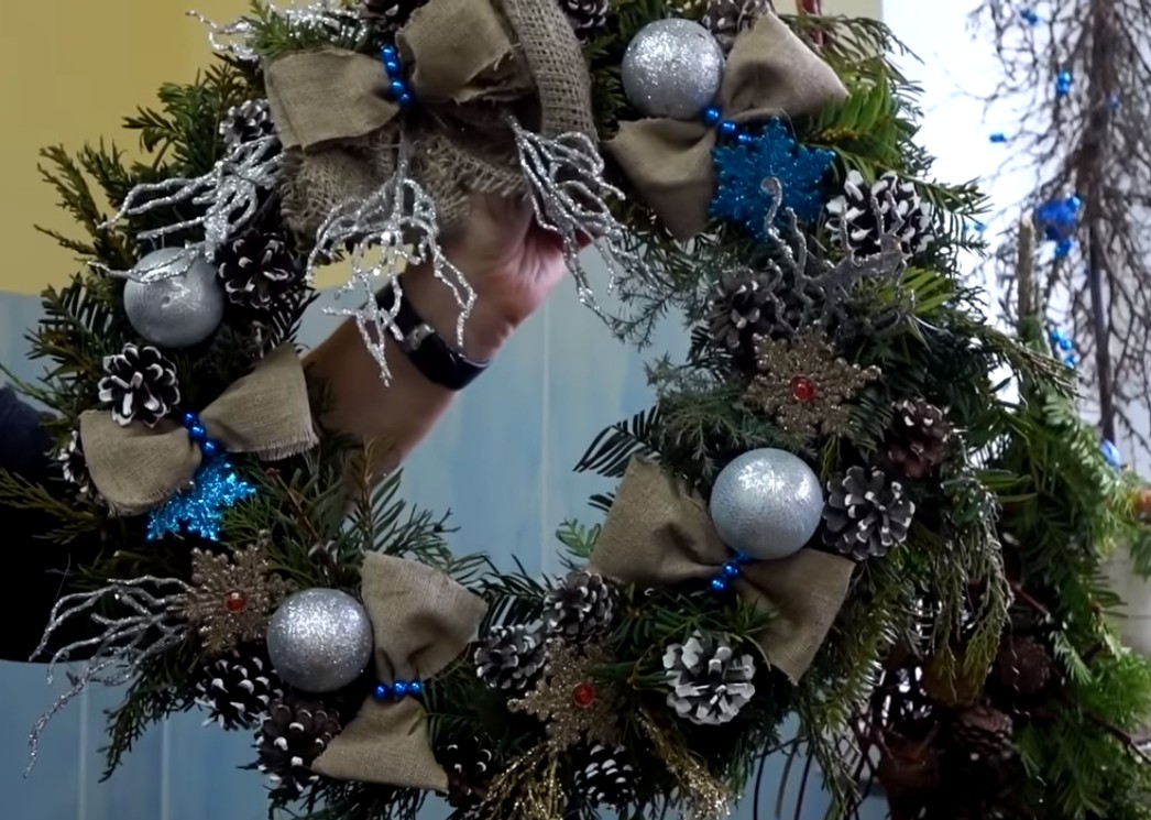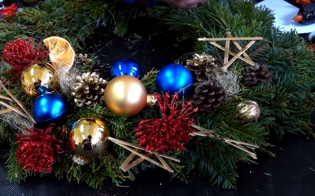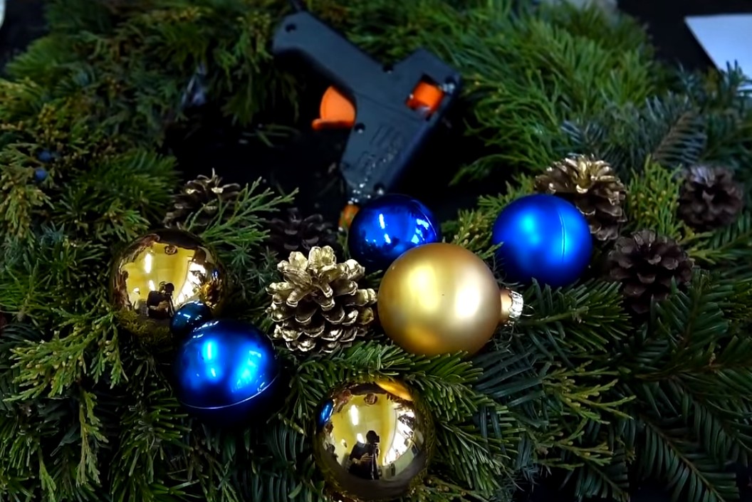 Берем подготовленный декор, в данном случае, это елочные новогодние шарики и шишки, располагаем его на венке и приклеиваем клеевым пистолетом.