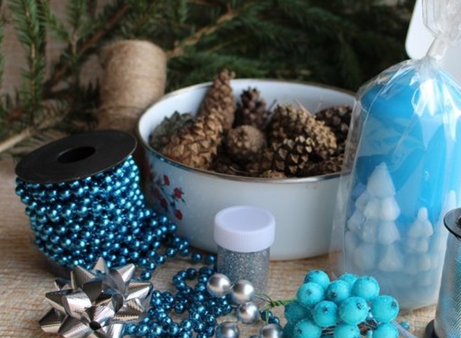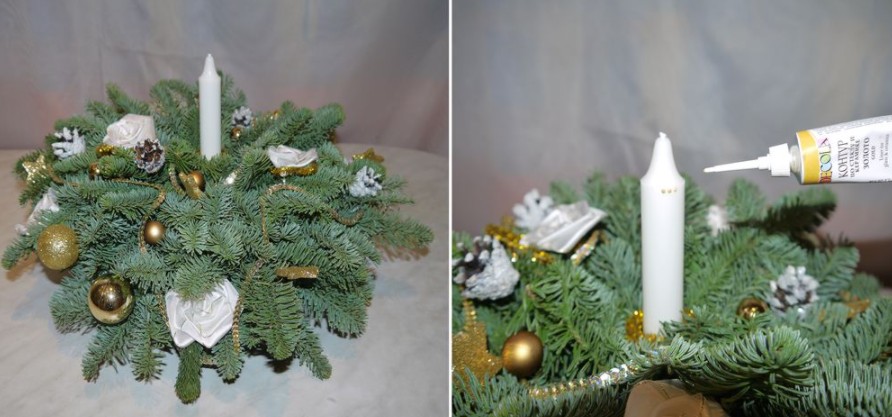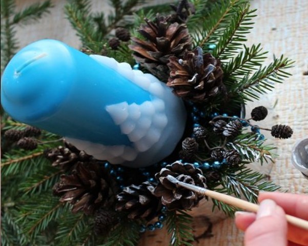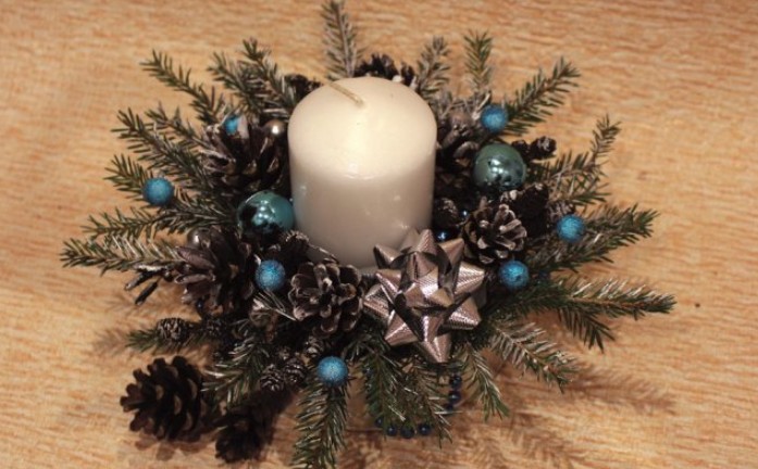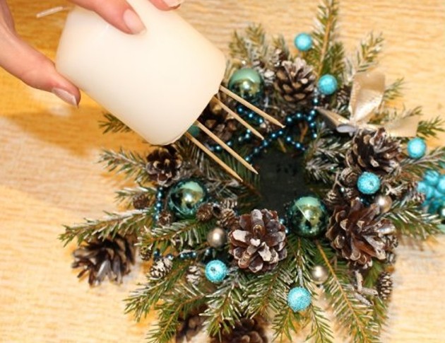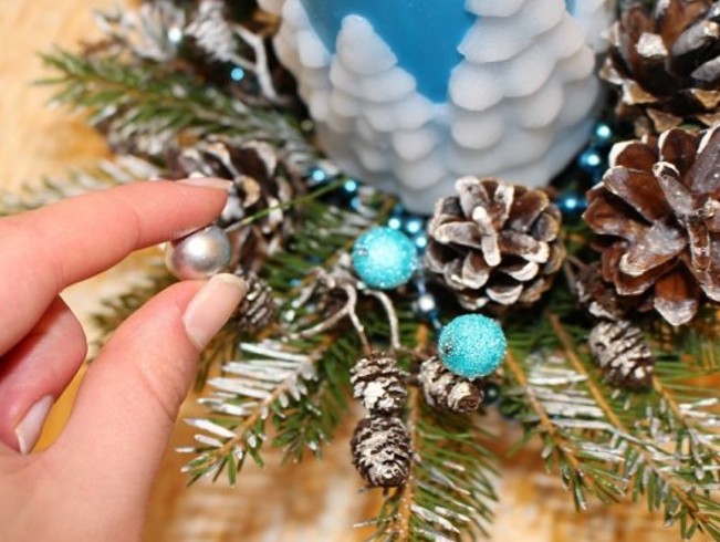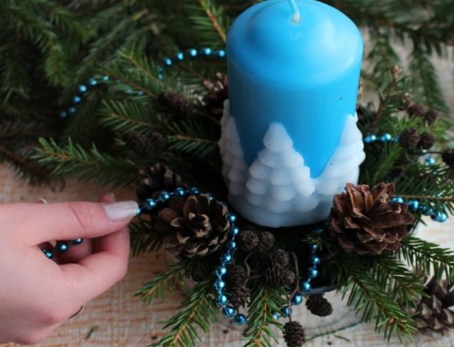 Вставьте в губку вокруг свечи небольшие еловые веточки, затем — шишки. Украсьте бусами.