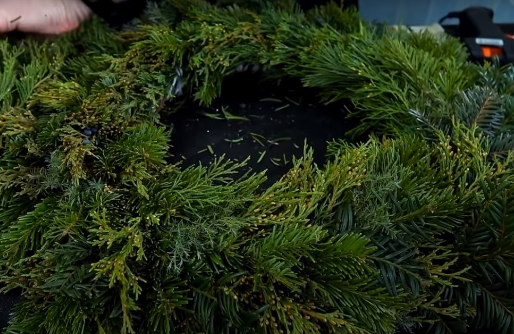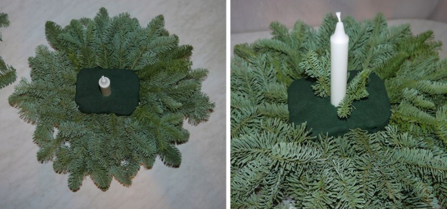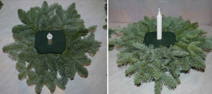 Средними ветками по кругу формируется второй ярус. Для образования третьего яруса самые маленькие ветки следует втыкать, начиная от центра.