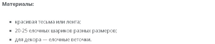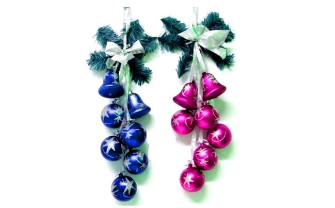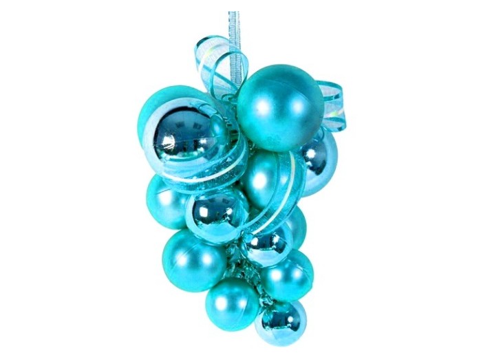 Возьмите декоративную красивую ленту и проденьте ее в отверстия елочных шаров, предназначенных для закрепления на елке. Нанизывайте шары снизу вверх, время от времени перехватывайте основание проволокой. У вас должен получится конус, напоминающий, виноградную гроздь. Завершите композицию — добавьте сверху еловые веточки, перевяжите их лентой.