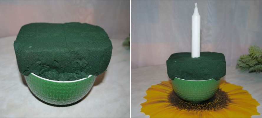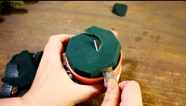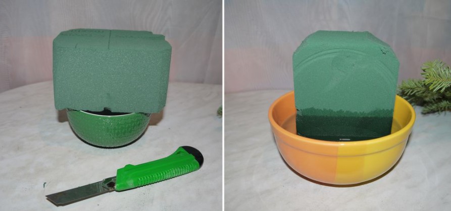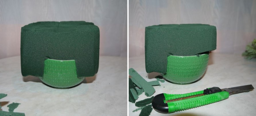 Оазис, предварительно намоченный, обрежьте и поместите в чашку.