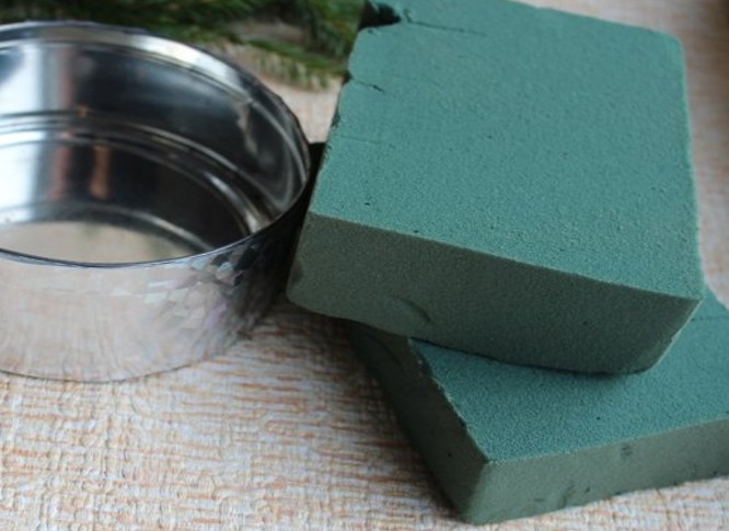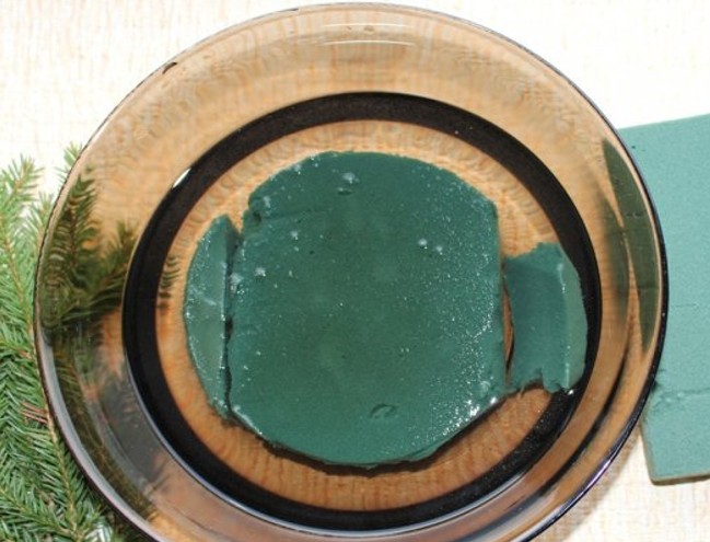 Флористическую губку примерить под керамический горшок и обрезать таким образом, чтобы она выходила за его пределы на 3 см с обоих сторон. Поместить ее в емкость с водой, чтобы она полностью пропиталась.