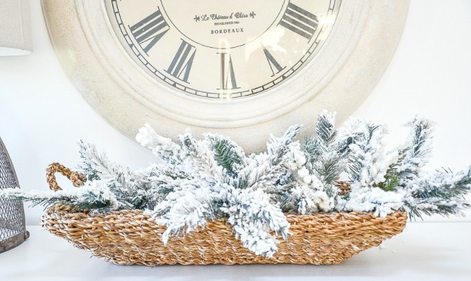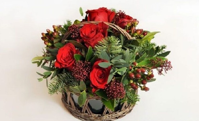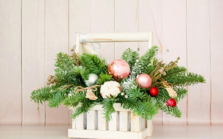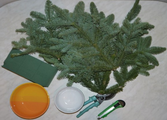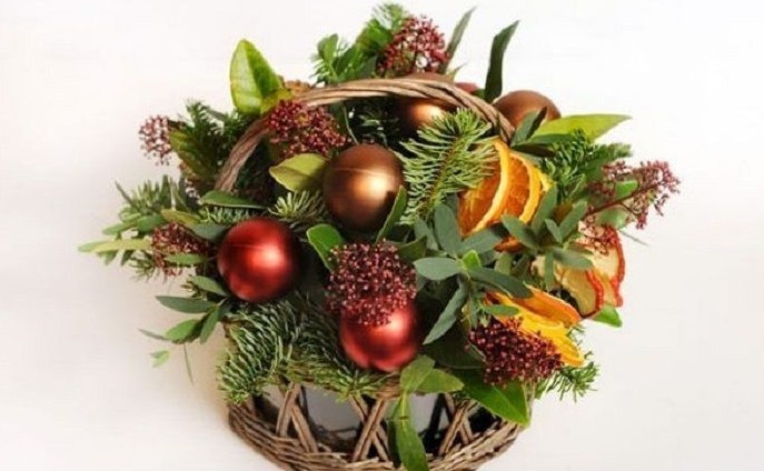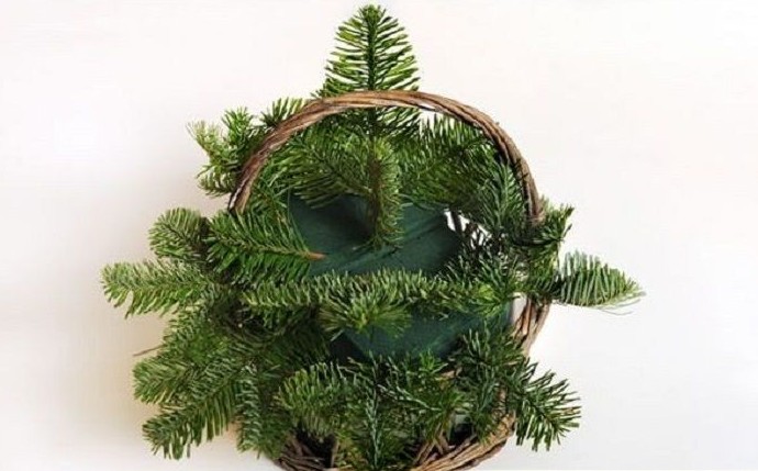 Флористическую губку смочить водой и установить в корзину, на дно положить тарелку, в которую будет стекать вода. Красиво расположить еловые ветки, втыкая их в губку.