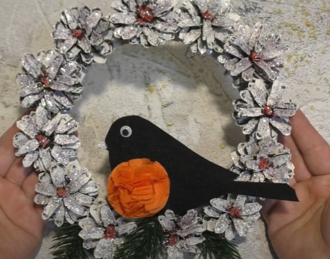 - Отсортируйте шишки по размеру и приступайте к их приклеиванию. У основания — самые крупные.