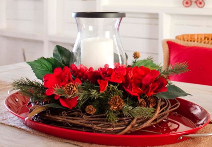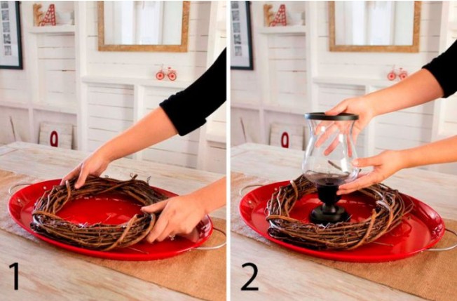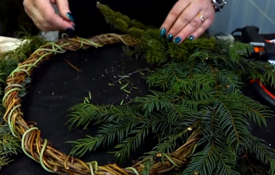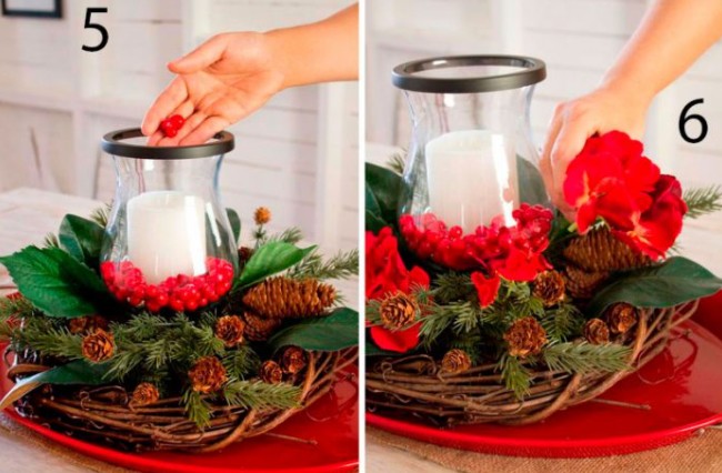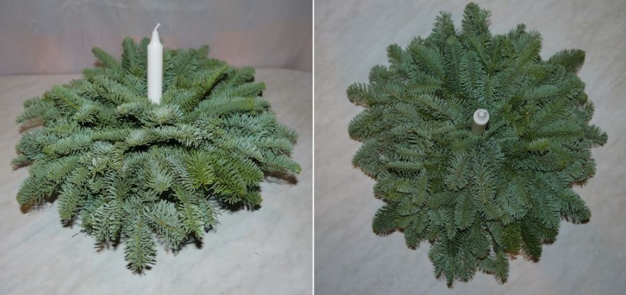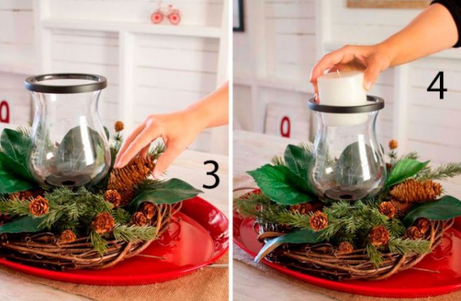 В центр поставьте вазу, пространство между венком и вазой заполните еловыми веточками и искусственными листьями.