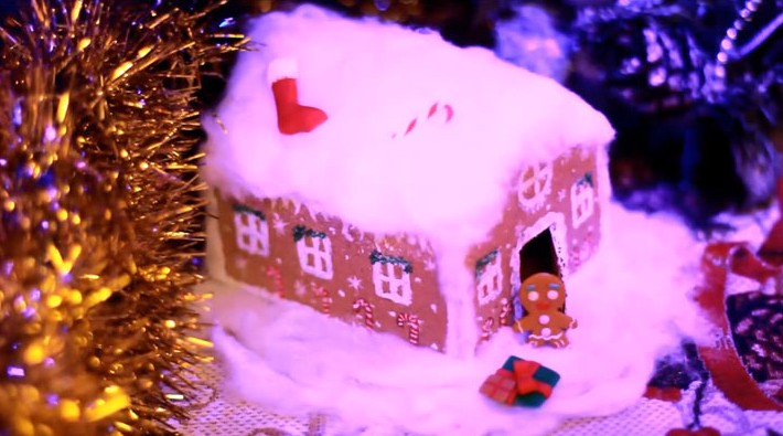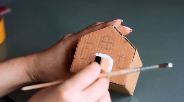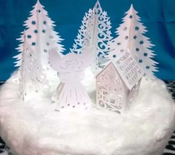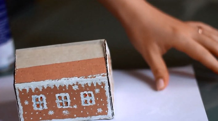 На крышу положить вату — имитация снега. Расставить фигурки и украсить новогодней мишурой.